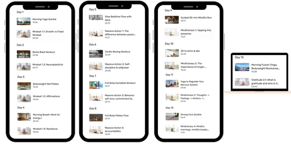 Each day, you’ll get one short movement class and one mindset boost to help you feel strong, calm, and clear again. Think flows, strength, pilates, breathwork, and feel-good mental resets all in under 30 minutes a day.